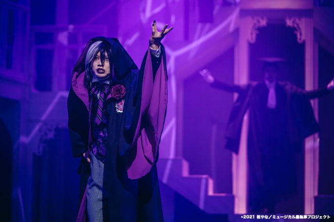 ドラマティックでミステリアスな音楽の中で歌い踊る学生たち、そしてシエルとセバスチャン。紗幕に映し出すシルエットや映像を駆使した見せ方は、ホーンテッドマンション的な不気味さを醸し出し、時折浮かび上がる葬儀屋(上田堪大)の甲高い笑い声と相まって、“生執事”の世界観に惹き込まれていった。