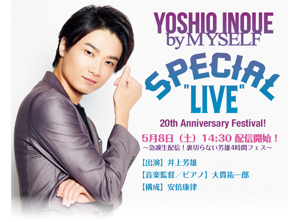 デビュー20周年を迎えた井上芳雄が、アニバーサリーイヤーを祝して、多彩なゲスト陣と盛り沢山のプログラムでお贈りする「井上芳雄 by MYSELF」スペシャルライブ配信“20th Anniversary Festival!~急遽生配信!裏切らない芳雄4時間フェス~”を、5月8日(土)に東京国際フォーラム・ホールAにて、無観客生配信で開催する。