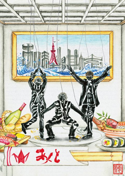 “文字”で“絵”を表わすという独特の書道アートでIMYの3人を表わし、それだけではない“発見”が随所に秘められている。