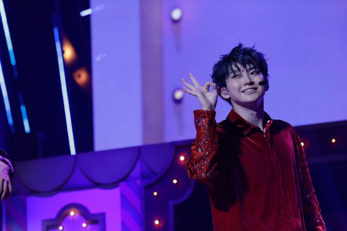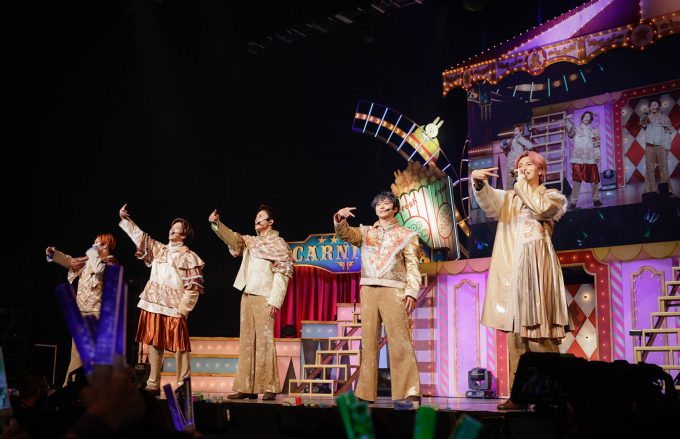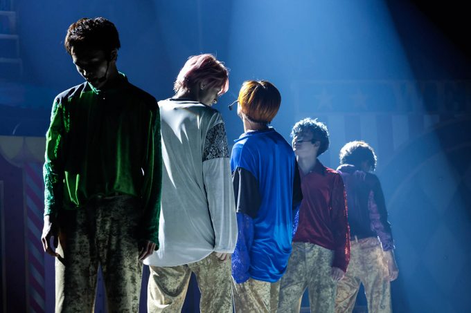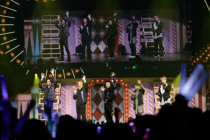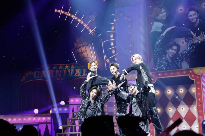 ユーキが「今日は絶対忘られない1日にしましょう!」と声をかけ、続く「Beauty Spider」では、これまでとは違う妖艶な姿を見せる。ダンスブレイクでは見事なシンクロダンスで圧倒させたかと思えば、一列になってスタートした「Four Seasons」では、投げキッスに会場が大興奮! リョウガの「シートベルトは締めてください」という声から休む間もなく「Dive on week」から始まったメドレーでは、8号車とメンバーがコミュニケーションをとる「Summer love」や“kiss me baby”というフレーズでビジョンにタクヤがアップで映し出された「Kiss Me Baby」で会場が大きく揺れ、ユーキがバク転をして「キズナアルゴリズム」へ。メンバー同士の寸劇も混じる“だるまさんが転んだ”からスタートした「浮つきWAVES」や、会場を一気に燦燦と太陽弾ける夏に変えた「CALNAVAL」と、メンバーだけでなく、8号車のみんなが楽しそうな姿がとても印象的だ。