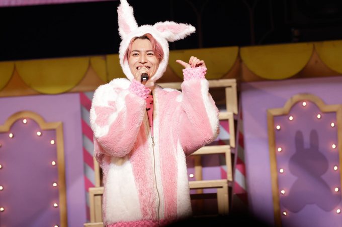 突然ビジョンに謎のユニット“ぴょん特急”の姿が映し出される。これは今回のツアーモチーフでもある“ウサギ”を用いて、超特急メンバーがウサギのアイドルになったもの。ステージにはウサギに変身したメンバーが登場し「ウサギミック」を披露。それぞれが“キュンキュンビーム”を放ち会場をメロメロにしつつ、「Guilty」をキュートにパフォーマンス。「Добрый день(ドーブリジェン)」では、たかぴょんがダンスを踊り、4人がガッツリ歌うなど楽しませた後、まさかのリョガぴょんのしっぽが落ちる事件も勃発するも、「Full moon」をしっとりと歌い上げ、エンターテイメント性は抜群!