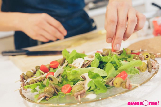 前菜のピンチョスはアンチョビ、オリーブ、そして「本当はギンディージャ(スペイン産の青唐辛子の酢漬け)」が良かったんだけど……」と言いつつ、手に入らなかったとのことで、グリーンチリ(青唐辛子の塩漬け)で代用し、手際よく串に刺していく。