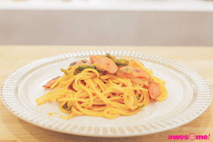 実は、猪塚の誕生日のお祝いということもあり、竹財との対談があること以外は詳細を説明せずに来てもらっていた。「見てればいいですか?」「邪魔じゃない?」と自分の立ち位置に戸惑いながらも、材料を見るや「これ、完全にナポリタンじゃないですか! 嬉しい~!!」と大喜び。そこからは、調理をする竹財の隣りに猪塚が並び、お互いの近況などを話しながら順調に進んでいく。