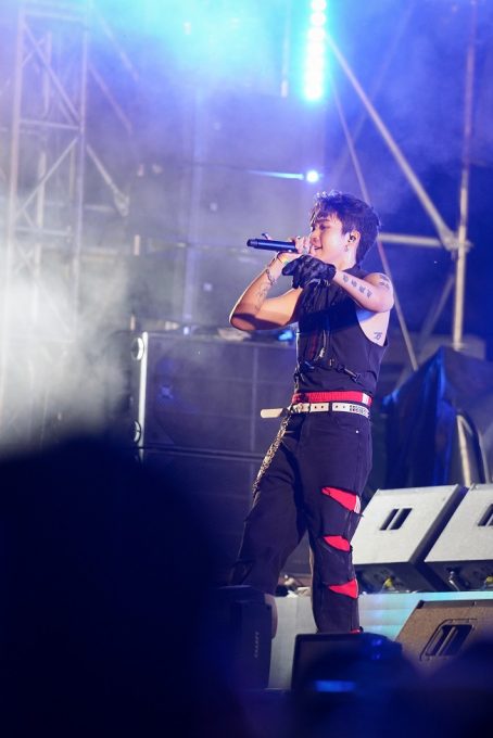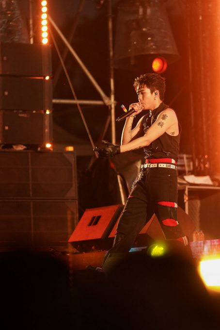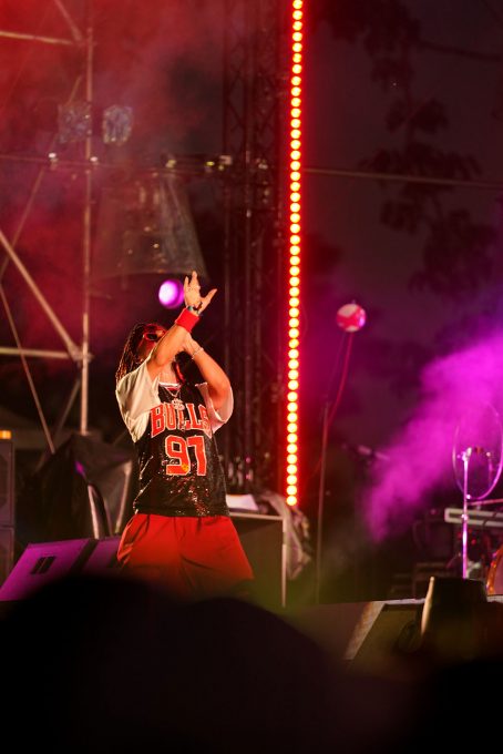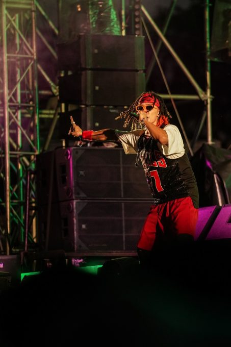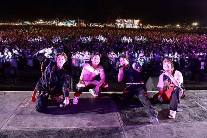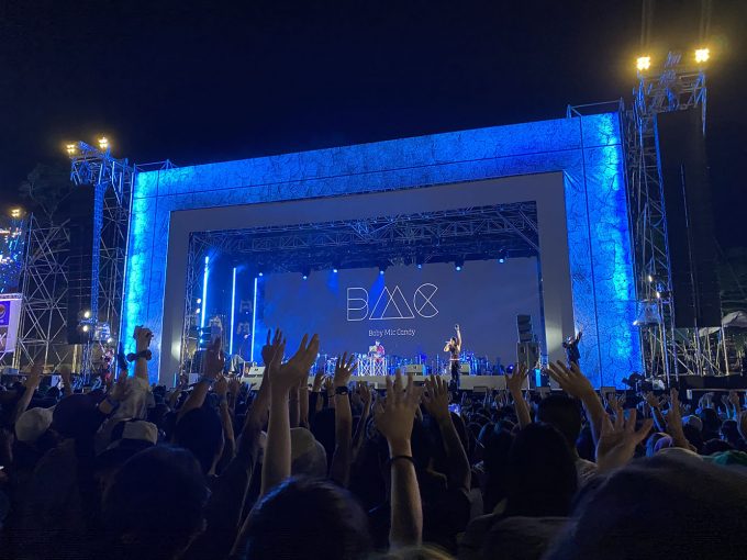ステージ中央に構えたDJによるSolo Timeではその先のライブへの期待に胸が躍り、BMCの世界へ誘う。インパクト溢れるビジュアルも印象的だ。徐々にその音楽に誘われるように人が集まり始め、そこに合わせたかのように陽が落ち、暗くなった瞬間、MOTOが先陣を切り「Baby Mic Candy~!」と声をあげながら登場すると会場からは大きな歓声が溢れる。GOLI、FIAT、YUKIも手をあげながら勢いよく登場し、1曲目の『Spit The Verse』がスタート。赤く燃えるようなビジョンと、彼らの勢いが重なり、一気にテンションをあげていく。会場で座っていたお客さんたちも次々と立ち上がり、その場はダンスホールのように変化していく。曲が進むにつれて、4人が等間隔に広がり、手をあげ、FIATが「HANDS UP!」と叫ぶと一気に手があがり、フェスならではの一体感を感じることが出来る。GOLIの勢いよくたたみかけるラップと、YUKIの力強さの中に爽やかさを感じるラップが重なり合う瞬間や、4人が揃ったステップを見せたりと、1曲で様々な色を見せるところも魅力的だ。