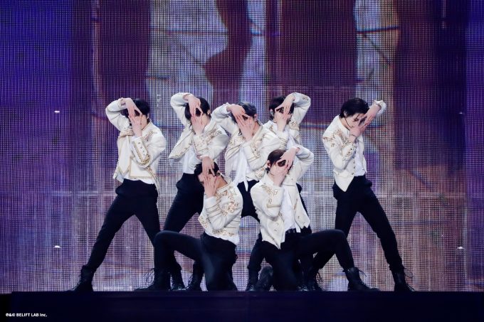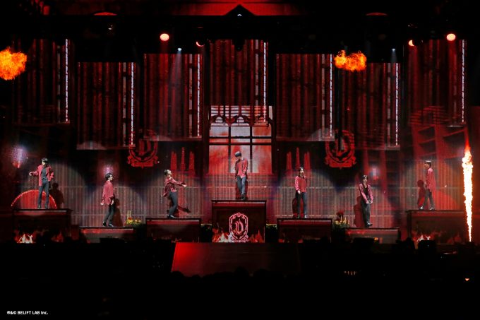 イメージビデオを使ったストーリーを挟み、前半戦とは違った世界観のハードでダークな印象のナンバーを間髪入れずに届けていった中盤戦では、炎が燃え上がる激しい特効の中「Drunk-Dazed [Japanese Ver.]」「One In A Billion」「FEVER」といった並びで楽曲を届け、ENGENEを虜にしていった。「One In A Billion」から「FEVER」へと続く流れは、ENGENE達が特別に好きな流れなのだが、パフォーマンスが激しい2曲とあって、メンバー的にはこの流れで届ける時には、体力が奪われるのだとか。ビシッとキメたブロックの後に、身近に感じさせる赤裸々なトークのMCは、いわゆる“ギャップ萌え”であろう。ENGENE達の7人への想いが更に熱を持った瞬間を感じ取れた。