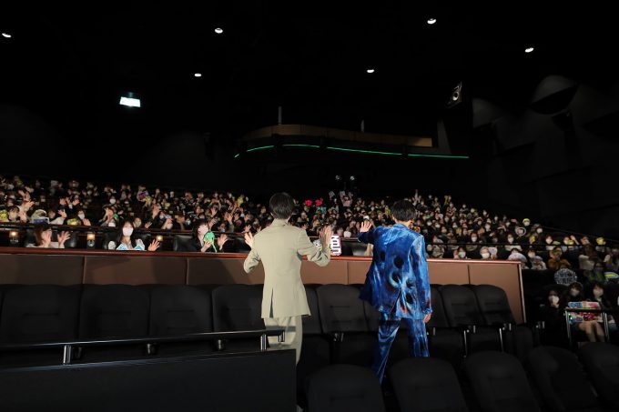 この日、映画の上演後に登壇したのは、主演を務める萩原利久と八木勇征。会場の真ん中にあるドアからサプライズで登場すると、この日選ばれたお客さんたちから歓声が起き、それに応えるように2人が手を振ると、声出しが解禁された会場は大盛り上がり。