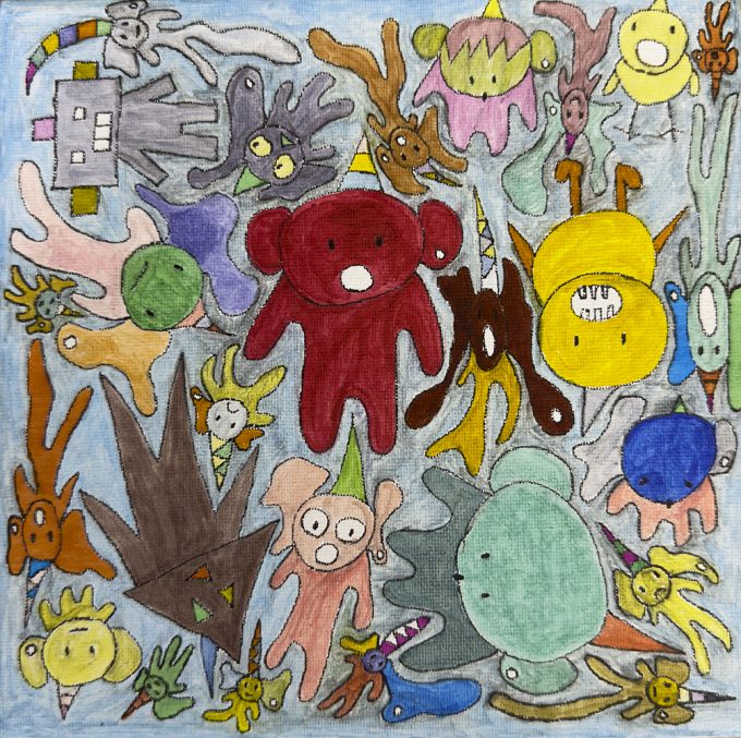 「たしかに、計算して描いてる感じにも見えるかもね。でも、ほんまに何も考えて描いてない。思うがままに、そのときに描きたいものを描きたい色を使って描いてるだけ」