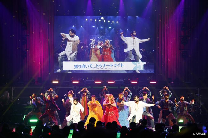 そんな中盤ブロックの締めは、“ハンサム”らしいコミカルな演出が光った「振り向いて…トゥナートゥイト」。ステージにサリー風のドレスを纏った青柳、山﨑、青山、本島と民族衣装風の恰好に髭をつけた岩崎、福崎が現れ、歌う他のメンバーたちの前で寸劇を展開。某人気インド映画をオマージュしており、あの有名なダンスバトルも再現されて、結果、青柳と岩崎が結ばれるという結末に(笑)。青柳の女装は“ハンサム”ファンの間では、“塁子”というキャラクターで定着していることもあり、いろんな角度から笑いを起こさせる一幕となった。