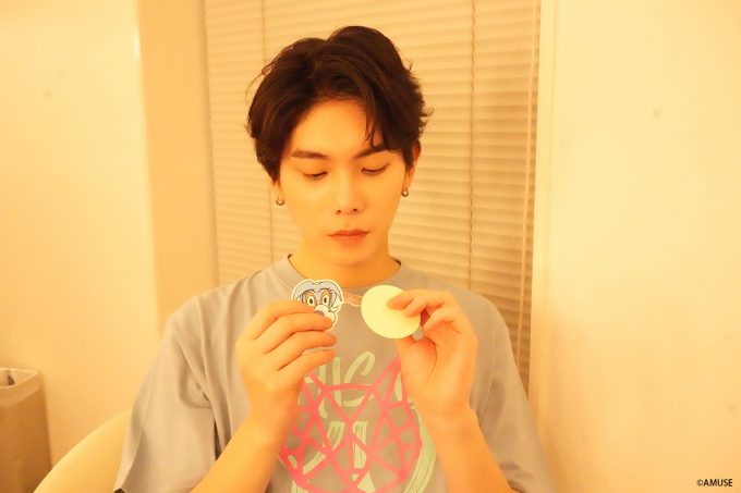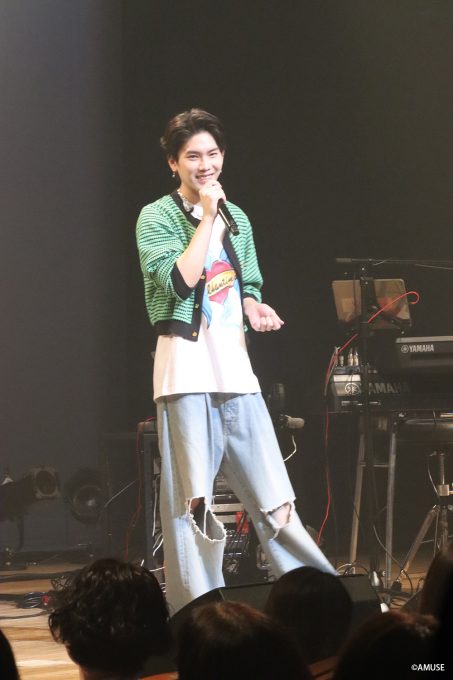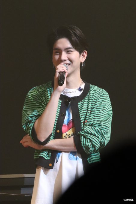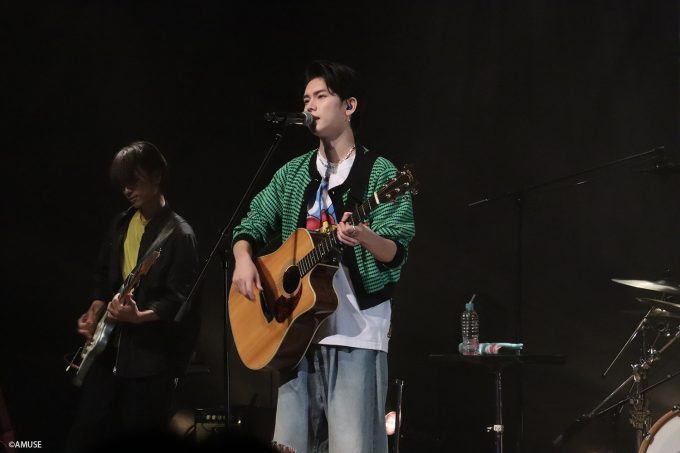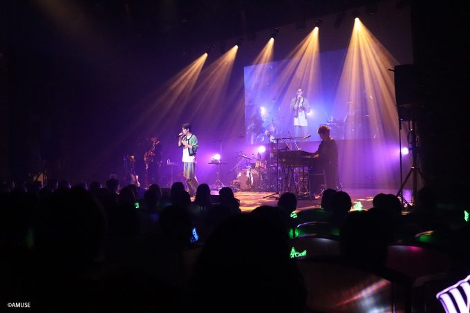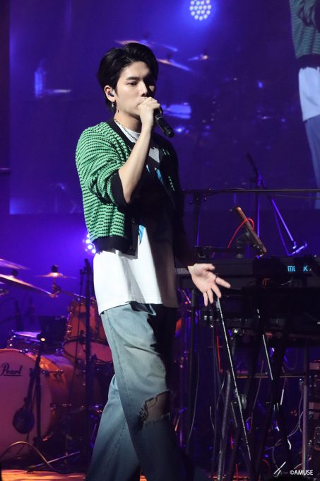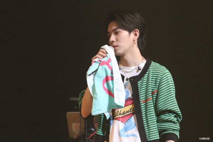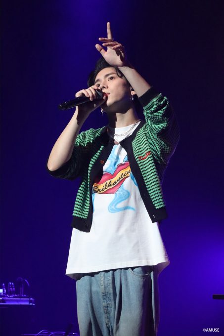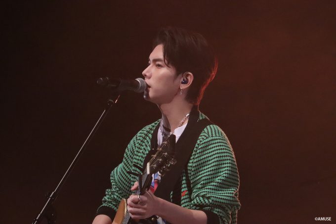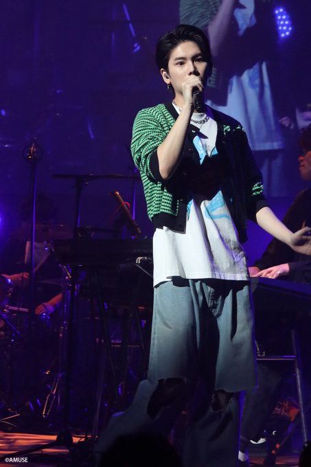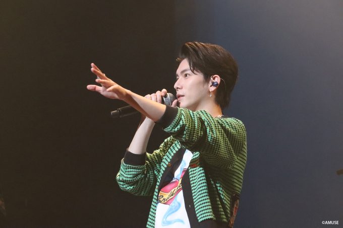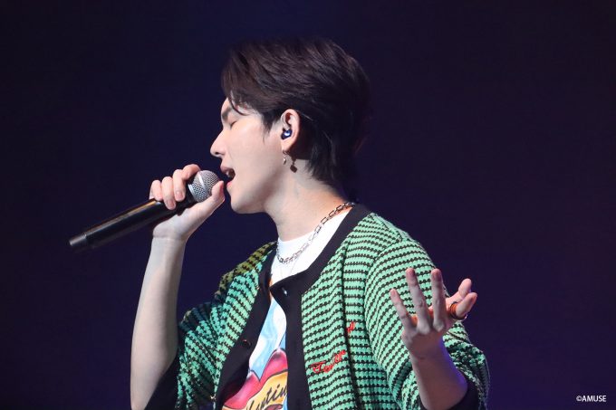 続く「アシアト」の曲紹介を日本語と中国語で。美しいメロディと夕焼けみたいなオレンジ色の照明が混ざり合い、どうしようもない不安と震える勇気を響かせる。〈今は最後の涙に身を任せて〉で頬に添えた手のひら、〈芽吹いたこの気持ちで照らさなくちゃ〉と歌うまっすぐな強い視線など、振り付けではない繊細な表現はつくづく俳優の歌だなぁと思う。