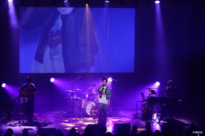 おなじみの荘口彰久さんを迎えてのMCコーナーでは、4周年を迎えられたことへの感謝の言葉から始まり、「合図をきっかけにステージへ出てみたら、聴いたことない音楽が流れてきて踊ってごまかした」などという世にもかわいい悪夢話を経由して、「remembering」の英詞に込めたグローバルな活動への情熱、「弱虫」で描きたかったヒーロー像解説、さらにこの2曲の新曲の制作風景&リリックビデオのメイキング映像をYU越しに観て、本人から直接秘話を聞くという濃密さ。ちなみに「弱虫」のビデオに登場する付箋と紙吹雪のシーンは、撮影前日にYUが思いついたアイデアだったそう。