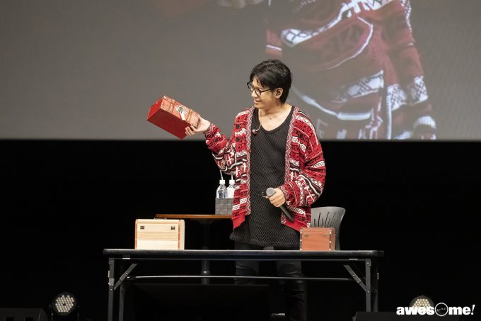 続いては、ファンも協力して行なう“名探偵Singtoのカギを探して宝箱を開けろ”のコーナー。会場内に隠された6つのカギの中から本物の3つのカギを探して、ステージ上の3つの宝箱を開けることができたらクリアとなるゲーム。 1つめ、ステージに隠されたカギを瞬時に探し当てて宝箱を開けると、中にはSingtoさんが大好きなドラえもんのぬいぐるみが。2つめのカギは、2人のお客さんの椅子の下に隠されており、どちらかが正しいカギ。その席のお客さんと“あっち向いてホイ”で勝ったらゲットできるということで、Singtoさんは客席の通路に降りてきて…この時点でファンの方々は大興奮。カギが隠されていた席の1人めの方と最初は練習で…あっち向いてホイ! …負けてしまったSingtoさんだったが、本番では勝つという勝負強さ。2人めの方とは激戦の末に勝利! そのカギで宝箱を開けると、やっぱりSingtoさんが大好きなピカチュウのぬいぐるみが出てきて超笑顔に。 3つめは4桁の数字をヒントに答えを導き出す謎解き問題が出題されたが、こちらも難なくゲット。最後の宝箱にはコナンくんが! 嬉しそうな顔のSingtoさんを観て嬉しそうな顔をしているファンの方々…という幸福感いっぱいの光景が広がった。