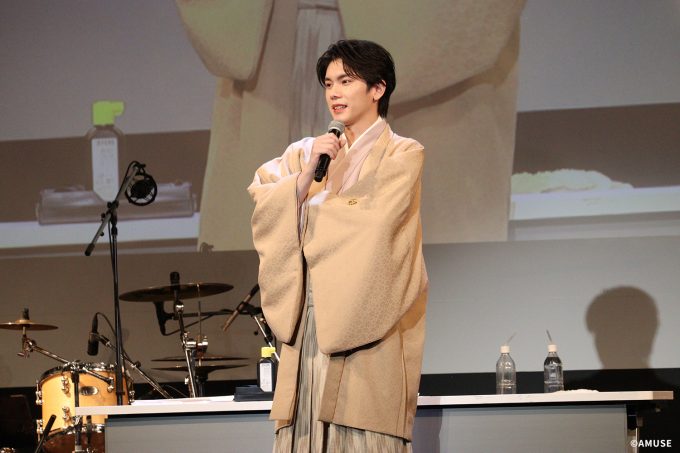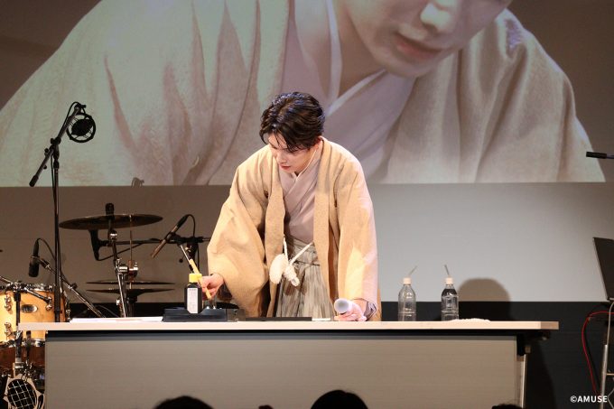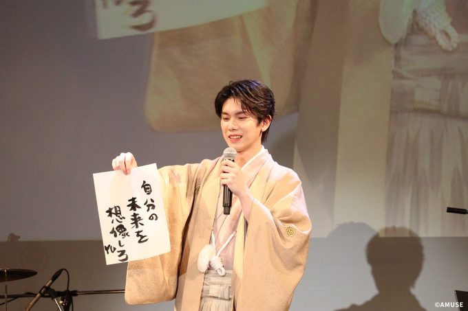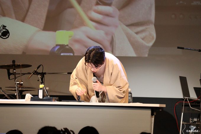 VTRを観終えたタイミングで袴に着替えたYUが再登場。新年らしく、したためた書き初めは「自分の未来を想像しろ」。3年前からケータイの待ち受け画面を飾るこの文章については、アニバーサリー本『YU 30th Anniversary Book「vs YU」』のインタビューで詳しく話してくれているので是非。