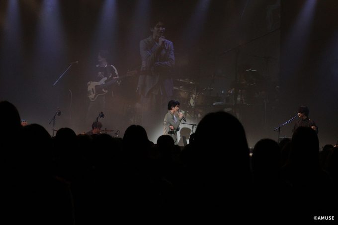 そんな心浮き立つ空気を一変させたのは、Keyの堀仁一郎が紡ぎ出す美しくもセンチメンタルなメロディ、オープニングナンバー「心鏡」だった。のちに語られたライブのコンセプト、「僕が日本で仕事を始めてからの軌跡をみなさんにお届けしたいと思います」との言葉通り、初めての日本語楽曲で、恐らくYU自身にもファンにも一番耳馴染みのある、そしてみんなで一緒に大切に歌ってきた曲だが、この日の「心鏡」はどうしようもなく息苦しくて。特にサビの〈嘘つきなんて 言わないで〉というフレーズが、君へのお願いから強い懇願に、最後は悲しい微笑みへと変移していく様は至極映像的で、ひどく胸を締め付けた。