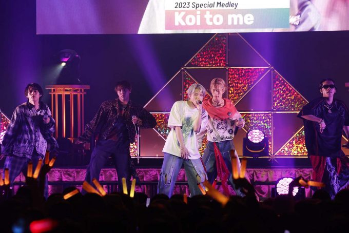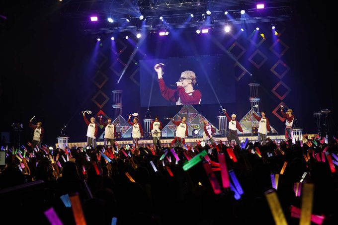 ここで次に歌う新曲を一緒に楽しむためのレクチャーをして、FUMINORIが「Sonic」とタイトルコール。エスニックな音とリズムの中でFUMIYAから始まった高速ラップからYUMA、SHOW…と繋いでいく。一定の波で刻まれていくサウンドと早口のリリックが心地よい。MORRIEとKEVINのロングトーンからクライマックスへ。合言葉の掛け合いもバッチリ決まっていた。 ♪君を信じるよ永遠に 大好きだmy buddy~と、SHOOTからバディへの告白から始まったミドルテンポ曲「OZ」。歌途中でHARUKIが「ヨコハマ大好き~♡」とほっぺハートをしたり、♪大好きだmy buddyの前に「せーの!」と声をかけてみんなで口ずさんだり、ハートフルな光景だ。一転、太いベースサウンドに乗ってFUMIYAの重量感のあるダンスパフォーマンス、FUMINORIは長い手足で華麗に魅せると、全員でピョンピョンと客席を煽りながらの「JEALOUS」は、恋する男の子のキュートな気持ち。ミラーボールに反射するイエローライトがクルクル回り、ホーンとリズムがご機嫌な「ENCHANT」、歌い出しのMORRIEの笑顔が眩しい! わりと自由な軽やかダンスにみんな身を任せていた。このブロックは、南の島にいるような気分だった。