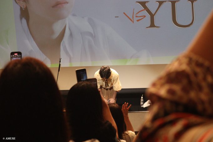 第一声は「ありがとうございます」だった。そして「YUです」「YUでっす」「YUですー!」三段活用みたいな挨拶で豪快かつ、晴れやかに盛り上げる。1年ぶりのトークイベントに不安を漏らした瞬間、「えーっ!」客席から総ツッコミが入ったのは、この挨拶ですでに会場の空気を掴んでいたからだ。三段活用に秘められた意図はのちに明かされますので、9月13日20時にライブ配信でご確認を。