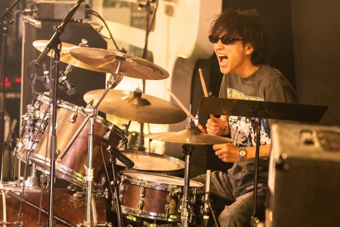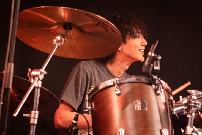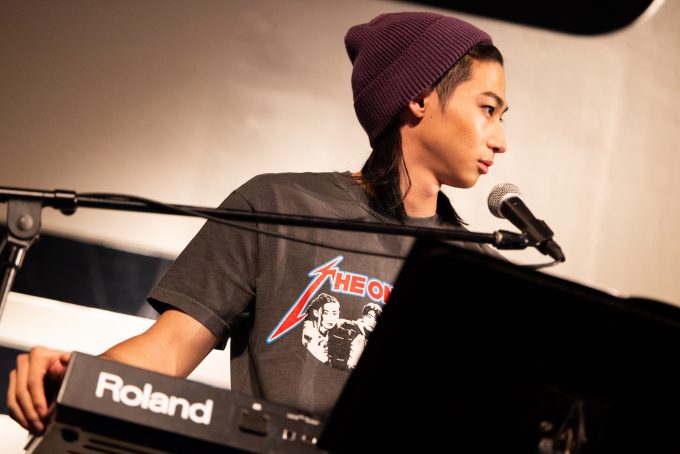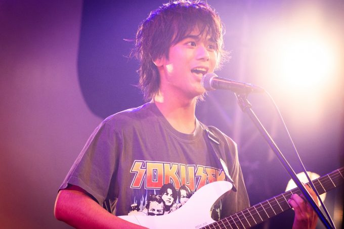 2組目のSokusekiもThe Onedaysとはデザイン違いのお揃いのオリジナルロックTシャツを着て登場。定位置に着くと、サングラスをかけたドラムの駒木根葵汰が軽くジャブを打つような音を鳴らし、それに観客が湧くと、島村龍乃介がギターを奏でて、BUMP OF CHICKEN「天体観測」からライブをスタートさせる。ボーカルの鈴木曉はイントロに乗せて「楽しんでいきましょう!」と観客に呼びかけ、原曲とはちがうオリジナル感のある歌い回しでSokusekiならではの歌を聴かせる。日向亘(Ba.)とPerth Nakhun(Key.)も真剣な表情で演奏をしながらも、軽快なサウンドをつむいでいく。The Onedaysからの勢いもあり、1曲目から大きな盛り上がりをみせた。