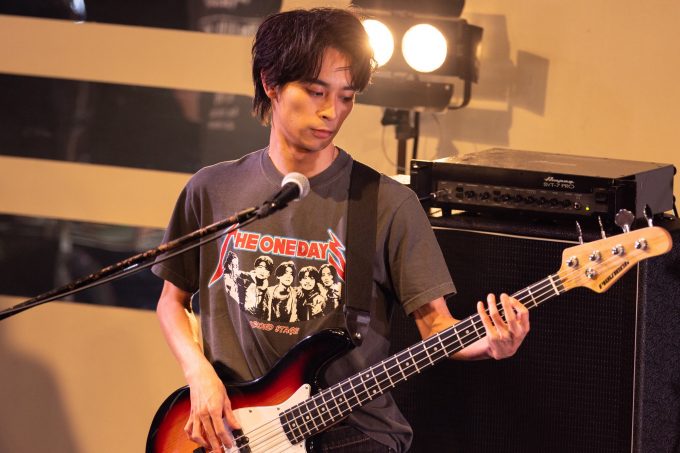 開演時間になるとまだ薄暗いステージに人影が現れ、それが1組目のThe Onedaysのメンバーとわかると観客が色めき立つ。お揃いのオリジナルロックTシャツを着た樫尾篤紀(Gt.)、藤田ハル(Ba.)、橘優輝(Key.)、そして、この日体調不良のためやむなく出演を見合わせた皆藤空良に代わるサポートドラマーの佐藤亮輔(mM7th)が定位置につき、ドラムのカウントからサザンオールスターズ「涙のキッス」がスタート。イントロをバックにボーカルらしく後からステージに登場した樋口幸平が、観客の声に応えるように手をあげてスタンドマイクの前に立つと、甘い歌声を響かせる。スローテンポの楽曲を一音、一音丁寧に確認しながら演奏するメンバーたち。その様子をファンたちも音に合わせて体を揺らしながら見守っていた。