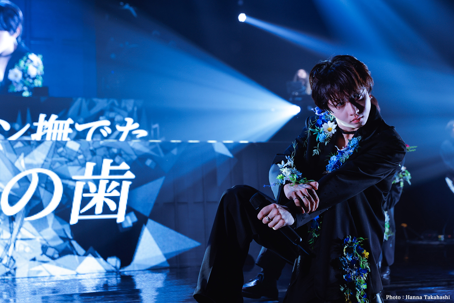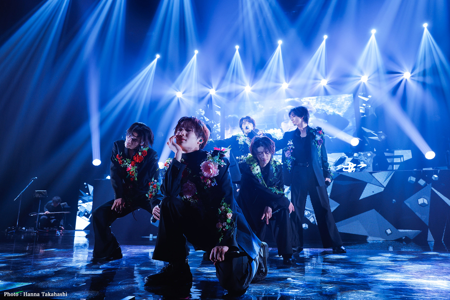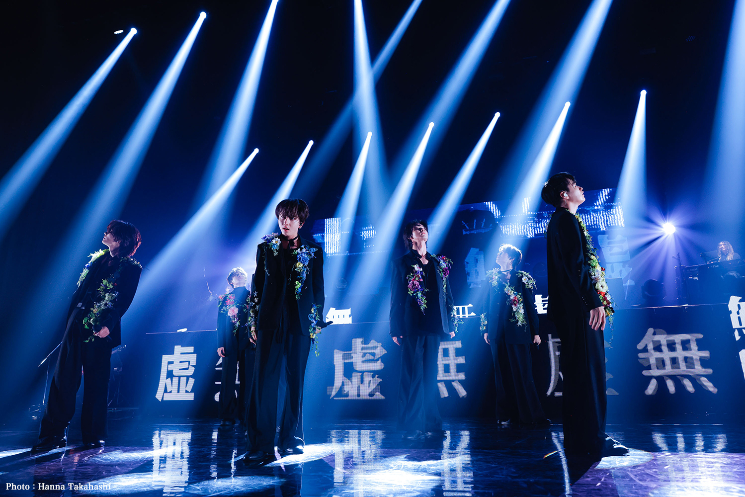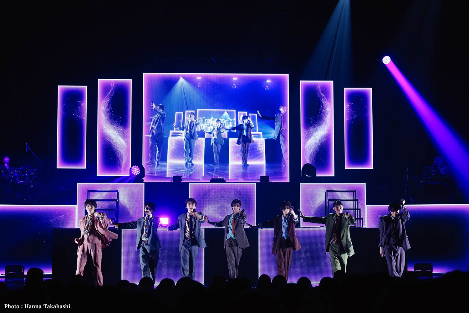 さて、幕間の劇的なバンド演奏はやがてヴィヴァルディの「春」へ。モニターには春の大地と青空が8ミリフィルム仕様で映し出されていた。ガツンと渋めのイントロで始まったのは、『文藝解体新書』のリード曲であり春をイメージした「ニヒリズムプリズム」。衣装チェンジした彼らは、春色の花をあしらった黒のタキシード姿が眩しい。フレーズ毎に変わる表情、不意に見せる笑顔に観測者はメロメロになる。7人の躍動感と観測者が振るペンライトの草原。これぞゲンジブ流春爛漫の風景だ。シャッフルのリズムでドラマティックに描かれる「柘榴」の夜の世界が明けるとペンライトが優しく揺れ始め、花びらが舞う映像と鍵盤の音をバックに大切に歌い始めたのはバラードアレンジの「桜Ground」。“届けたい想いだけ 小さなバッグに詰め込んで…”というこの歌はツアーの出発点にふさわしいと思った。桜が香るなか、彼らが咲かせた花がここから大きな桜の樹となっていく。