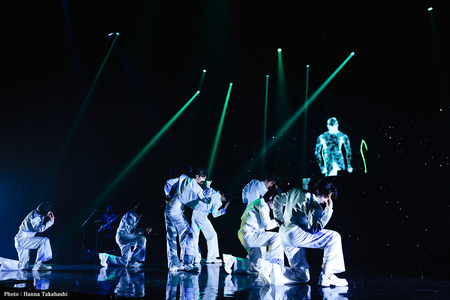 秋が深まり、季節は冬へ。衣装は皮のトップスにシルエットが綺麗なスラックス。ラブホラー並みの「Mania」から目まぐるしく展開していく。ライヴ曲として定番化しつつある「因果応報アンチノミー」は、「Mania」と同じ人たちが歌っているとは思えないほどの多幸感だ。シャープな動きながらみんな自由! 桜木の呼びかけに「JUDGE!」とコールする観測者の語尾には数えきれないハート模様がついていた。切ないアーバンポップ「Silence」では恋に悩める7人の姿があった。苦悩する歌詞とは裏腹になんと気持ちのいいサウンド。冬景色の道を歩くかのように始まったミドルテンポの「スノウダンス」は電子音のみのテクノハウスRemix。美しくシンクロするダンスが印象的…とうっとりしていると、ラストにバンドイン。すべてが華やかに色づいた。