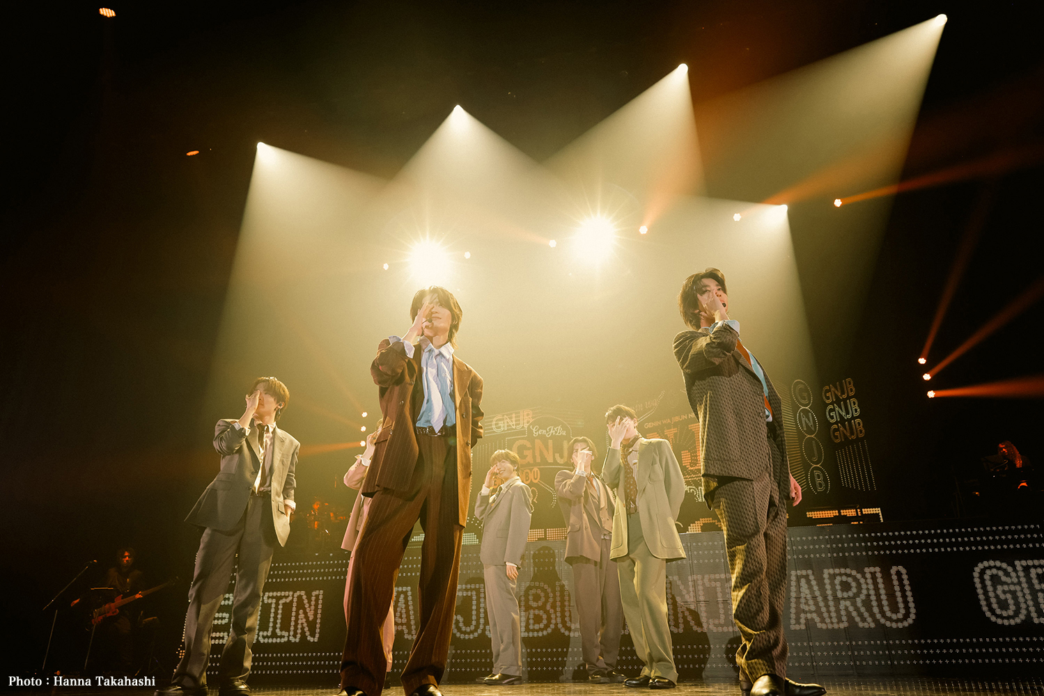 映像では雲や木々、海が倍速で流れてゆく。季節は秋へと移り、「愛無常」では落ち葉の舞う中、ダンディなスーツに着替えた7人がスティックと椅子を用いて歌の世界を表現。都会の夕暮れ時を歩くようなサウンドに悩ましい彼らの表情。特にベースの音は彼らのセクシーさに追い打ちをかけていた。続く「魔法をかけて」の背景は、ニューヨークのネオン街風だが、輝く電飾の文字はGNJB。そのパフォーマンスは映画『華麗なるギャツビー』を観ているよう。そんなウットリソングからの「ギミギミラブ」では観測者の熱烈コールが起こる。小泉が「声出していきましょー!」と煽れば一段と声援は大きくなり、その景色を愛おしそうに見ているゲンジブメンバーたち。大倉の「せーの!」で全員ジャンプ。「ありがとー!」と、真ん中で肩を寄せてフィニッシュした。