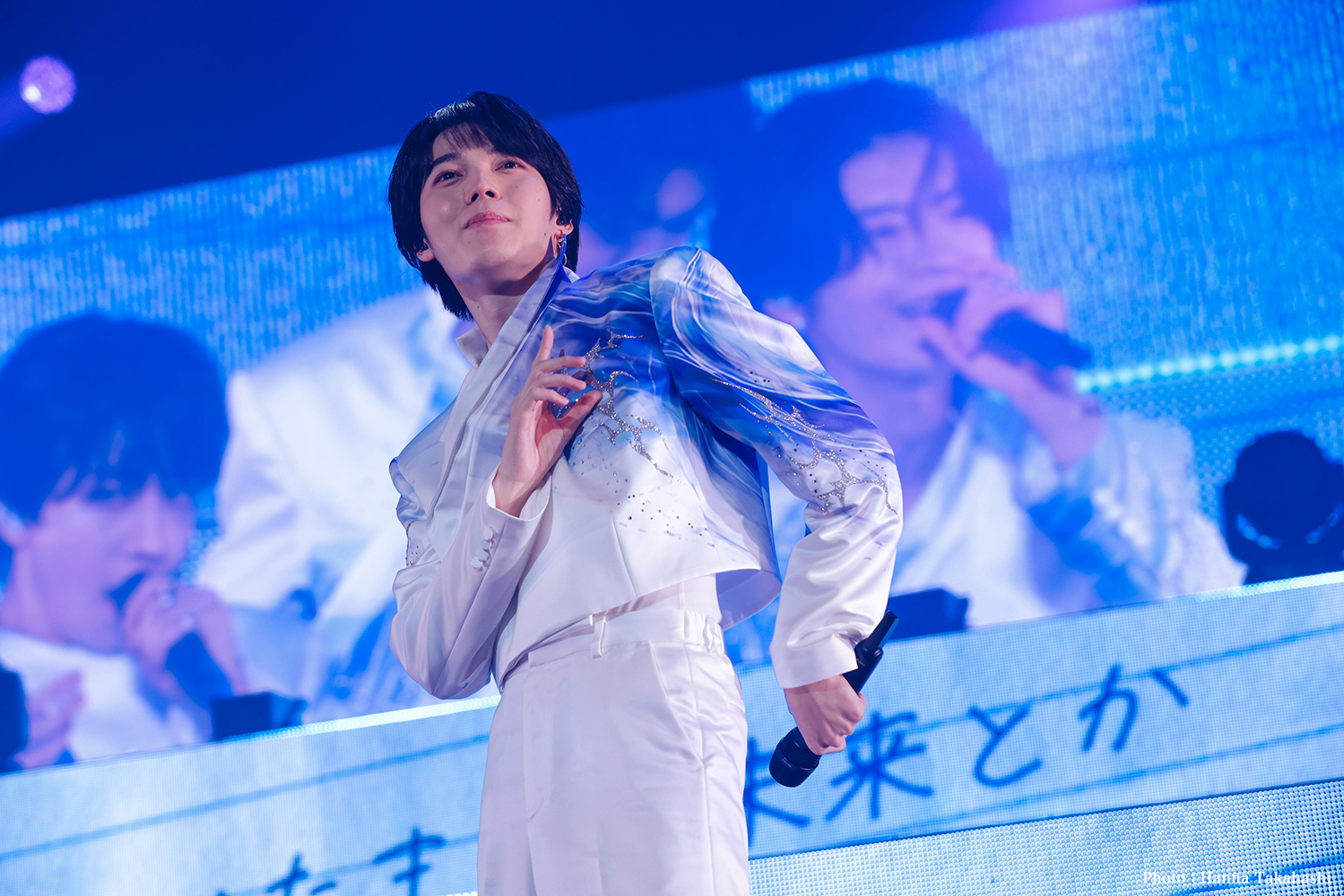 モノクロの世界から「NOW」で色付きの世界へ。メンバーの笑顔が弾け出す。カメラをモチーフにした歌詞に合わせて映し出された彼らの生映像はファインダー越しに覗いているみたいだ。ちょっとレトロなサウンドとパフォーマンスでみんなかわいくウィンクしたりほっぺハートを作ったり。でも吉澤の「こっち向いて♡」には勝てなかった。「トレモロ」もまた爽やか青春ソング。自由にアピールしながら軽やかにステップを踏む彼らの後ろに浮かぶ手描きの歌詞が、懐かしい日々のノートをめくっていくようだ。