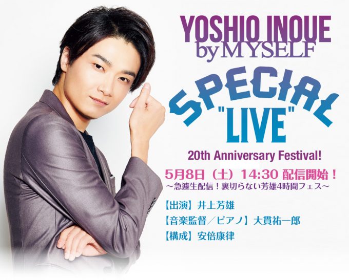 デビュー20周年を迎えた井上芳雄が、アニバーサリーイヤーを祝して、多彩なゲスト陣と盛り沢山のプログラムでお贈りする「井上芳雄 by MYSELF」スペシャルライブ配信“20th Anniversary Festival!~急遽生配信!裏切らない芳雄4時間フェス~”を、5月8日(土)に東京国際フォーラム・ホールAにて、無観客生配信で開催する。